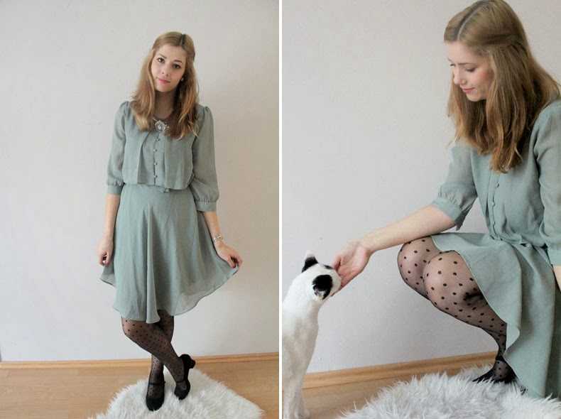 Wie ihr ja mittlerweile wisst, liebe ich Silber. Wir sind beste Freunde und man könnte fast meinen, dass wir unzertrennlich sind. Und ich habe endlich so eine Punktestrumpfhose gefunden (habe ich euch ja hier im Post vorgestellt). Das Kleid kennt ihr noch von meinem ersten Tag auf der Fashion Week Berlin - da habe ich es ebenfalls getragen. Das Kleid selber ist von mint&berry. Naja, Simba gehört nicht zum Outfit, aber er wollte anscheinend auch posen :)
